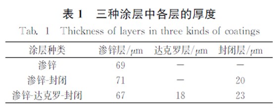 在滲鋅后處理領(lǐng)域,已開發(fā)出各種復(fù)合涂層,以 提高耐蝕性。在滲鋅涂層外浸涂封閉劑,經(jīng)固化后 形成封閉層,可有效封閉涂層表面微孔,延長涂層的 使用壽命[11-12]。達(dá)克羅涂層是一種由數(shù)十層被鉻酐 鈍化后的鋅、鋁片層疊加形成的膜層,具有極佳的耐 蝕性[13]。但達(dá)克羅涂層的耐磨性不佳,施工中的磕 碰易導(dǎo)致涂層破損,使其實際耐蝕性差于滲鋅涂 層[14],因此通常通過在達(dá)克羅涂層外部浸涂封閉劑 加以保護(hù)[15]。