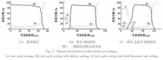 圖3為不同涂層截面 EDS線掃描結(jié)果。結(jié)果 表明:滲鋅涂層中鋅含量由表面(鋅質(zhì)量分?jǐn)?shù)約 92%)向內(nèi)緩慢下降,至涂層與界面處(鋅質(zhì)量分?jǐn)?shù) 約81%)后,開始急劇減少。根據(jù)計算及理論分析, 滲鋅層表層為Γ相層(FeZn10),靠近基體處為δ相 層(Fe11Zn40)[1819]。滲鋅-封閉涂層使用硅酸鹽封閉 劑,故在封閉層區(qū)域Si、C、O元素含量較高。滲鋅- 達(dá) 克羅-封閉涂層使用含鋁封閉劑,故在封閉層處有明顯C、O、Al元素分布;達(dá)克羅層則有Zn、Al、Cr、 O元素的分布。