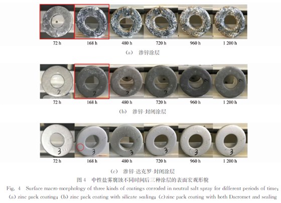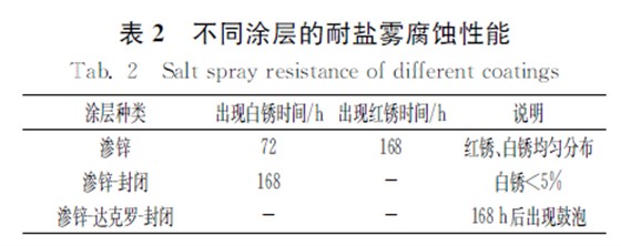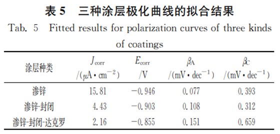 (3)綜合中性鹽霧試驗和電化學(xué)特征,滲鋅-封 閉涂層和滲鋅-達(dá)克羅-封閉涂層具有較滲鋅涂層更 為優(yōu)異的耐蝕性,其中使用含鋁封閉劑的滲鋅-達(dá)克羅-封閉涂層的耐蝕性最佳。