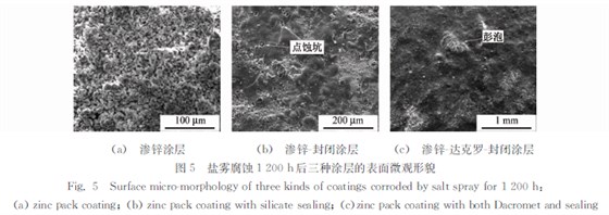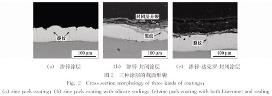 (2)滲鋅涂層的腐蝕形式主要為應(yīng)力腐蝕,即 腐蝕介質(zhì)通過應(yīng)力產(chǎn)生的裂紋直接進(jìn)入涂層中,腐 蝕產(chǎn)物又使裂紋進(jìn)一步擴(kuò)展,如此往復(fù),造成涂層的 嚴(yán)重腐蝕;滲鋅-封閉涂層中,封閉層的腐蝕主要表 現(xiàn)為點蝕和全面腐蝕并存的形式,點蝕坑可直達(dá)滲 鋅層,使?jié)B鋅層發(fā)生應(yīng)力腐蝕,全面腐蝕使封閉層厚 度明顯減??;滲鋅-達(dá)克羅-封閉涂層的耐蝕性優(yōu)異, 但封閉層存在剝離現(xiàn)象,可能對耐蝕性產(chǎn)生影響。