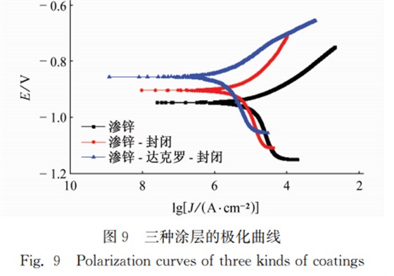 不同涂層的極化曲線如圖9所示,其擬合結(jié)果 如表5所示。可以看出,與滲鋅涂層相比,滲鋅-封 閉涂層和滲鋅-達(dá)克羅-封閉涂層的自腐蝕電位都有 所提高,且腐蝕電流密度顯著減小。腐蝕電流密度越大表明涂層的腐蝕速率越大,耐蝕性越差,因此滲 鋅-封閉涂層與滲鋅-達(dá)克羅-封閉涂層的耐蝕性都較滲鋅涂層的耐蝕性明顯增強(qiáng)。