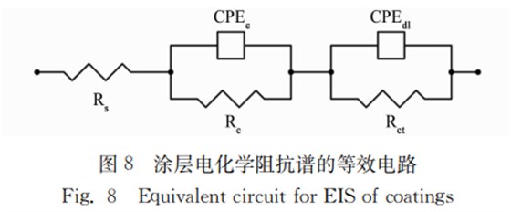 使用如圖8所示的等效電路對涂層的電化學(xué)阻 抗譜進(jìn)行擬合,擬合結(jié)果如表4所示。等效電路中, Rs 代表溶液電阻,Rc 代表涂層電阻,常相位角原件 CPEc 代表涂層總表面電容,Rct代表電荷轉(zhuǎn)移電阻, CPEdl代表雙電層電容。由表4可以看出,滲鋅涂層 和 滲鋅-達(dá)克羅-封閉涂層的涂層電阻處于同一水平,由于滲鋅-封閉涂層中封閉層導(dǎo)電性不佳,故其 涂層電阻偏高。滲鋅涂層的電荷轉(zhuǎn)移電阻較小,且 雙電層電容較大,對耐蝕性不利;滲鋅-達(dá)克羅-封閉 涂層具有較大的電荷轉(zhuǎn)移電阻和較小的雙電層電 容,與其良好的耐蝕性相一致。此外,與滲鋅涂層 比,滲鋅-封閉涂層和滲鋅-達(dá)克羅-封閉涂層具有更 高的總電阻值 (Rc+Rct),同樣說明其耐蝕性能 更佳。